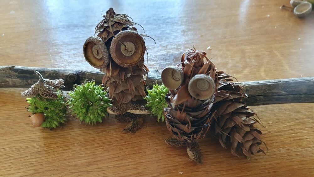 Da Douglasienzapfen eine federähnliche Struktur haben, lassen sich daraus schöne Eulen basteln. Die Augen sind aus Eichelbechern, Füße und Schnabel stammen von einer Buchecker.