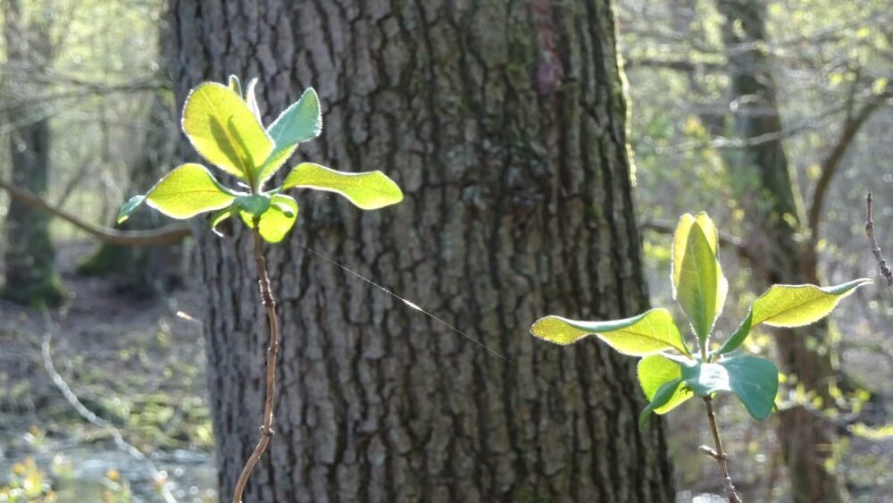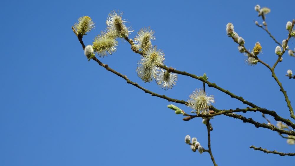 die Hecke überhaucht von Haselpollen,